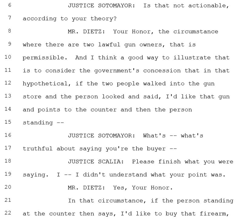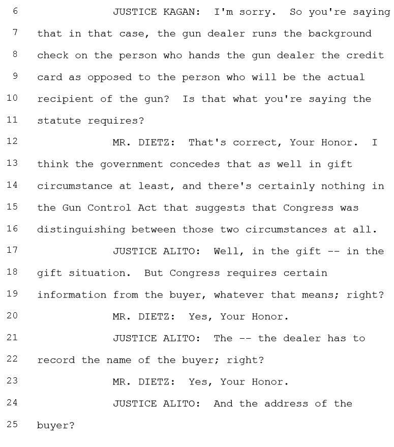 This can be seen in the case I wrote about, Abramski v. United States.The transcript of the oral arguments in this case can be examined here. You can also listen to an audio recording of the arguments that tracks the transcript here.